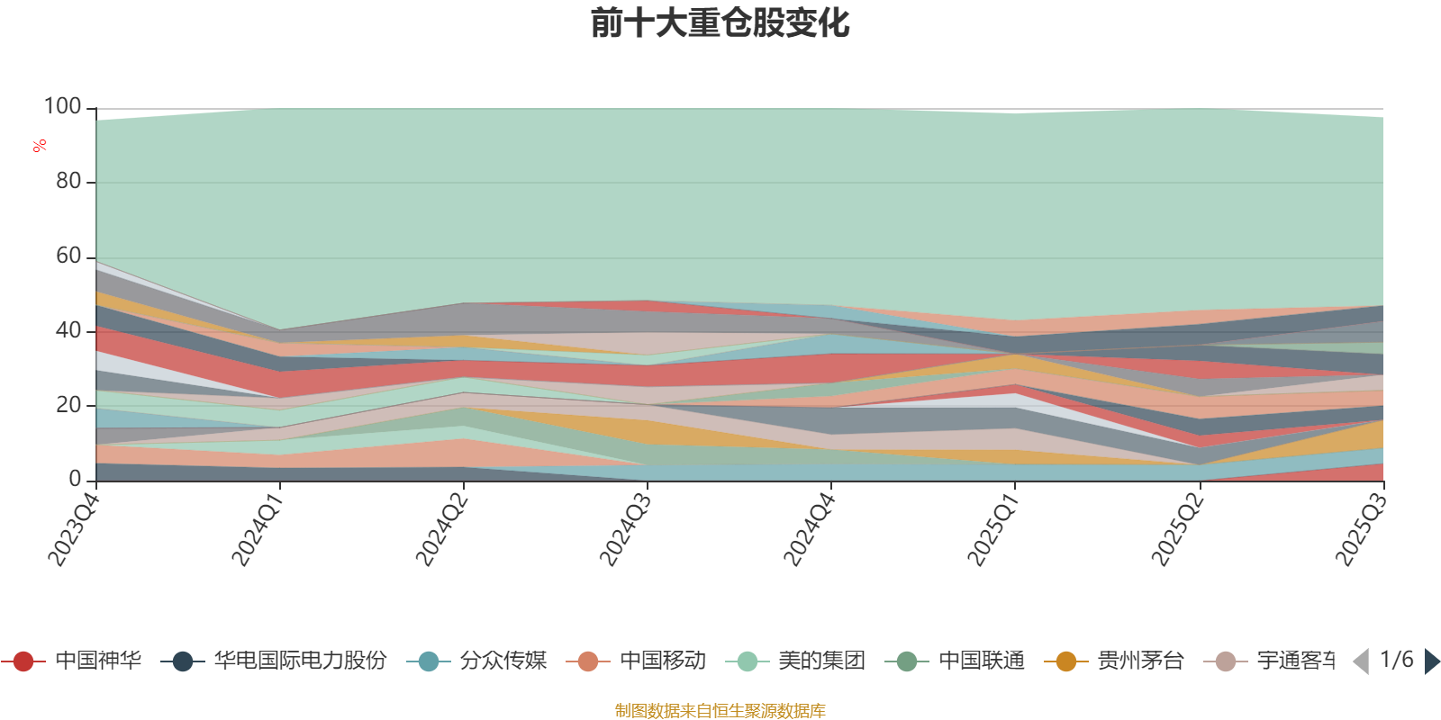截至2025年三季度末,基金十大重仓股分别是贵州茅台、六福集团、安徽皖通高速公路、中国神华、中国宏桥、分众传媒、龙佰集团、江南布衣、九兴控股、中联重科。
