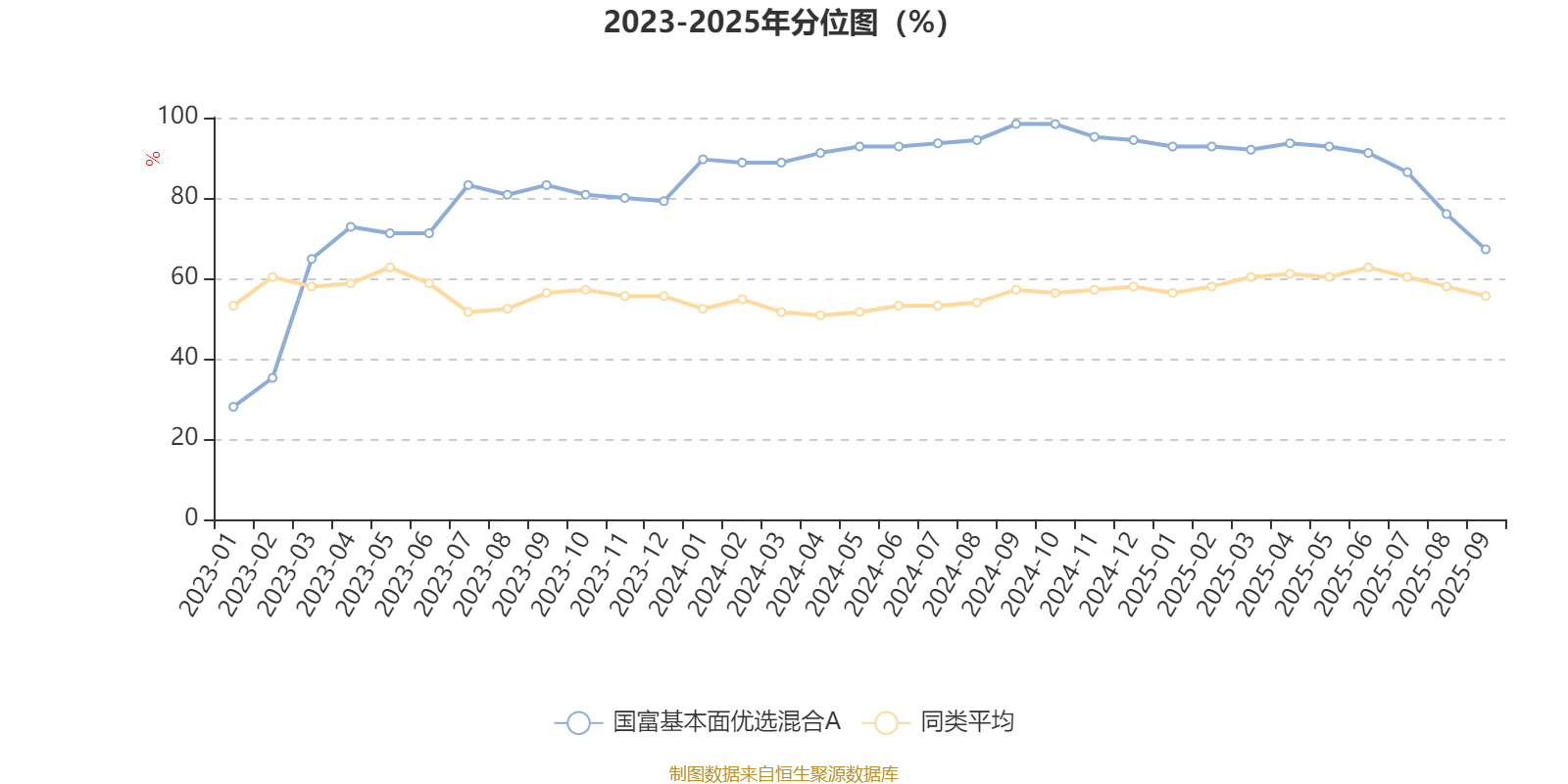 通过所选区间该基金净值增长率分位图,可以观察该基金与同类基金业绩比较情况。图为坐标原点到区间内某时点的净值增长率在同类基金中的分位数。