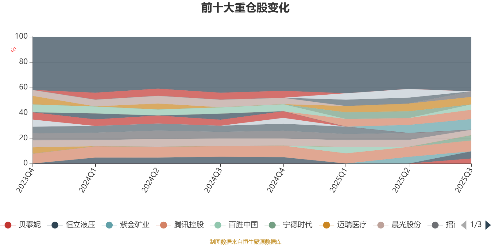 该基金持股集中度较高。截至2025年三季度末,基金十大重仓股分别是腾讯控股、中芯国际、阿里巴巴-W、快手-W、恒立液压、三环集团、晨光股份、三花智控、宁德时代、贝泰妮。