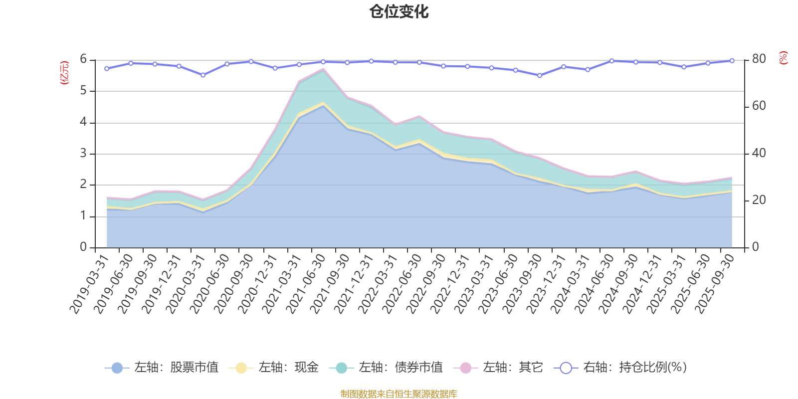 据定期报告数据统计,近三年平均股票仓位为77.37%,同类平均为72.35%。2025年三季度末基金达到79.64%的最高仓位,2023年三季度末最低,为73.36%。