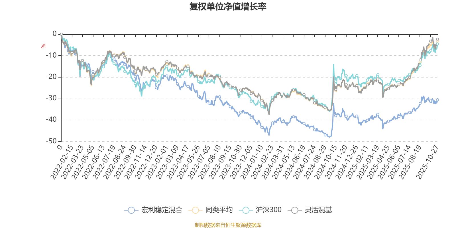 截至10月27日,宏利稳定混合近三个月复权单位净值增长率为6.61%,位于同类可比基金880/1287;近半年复权单位净值增长率为16.75%,位于同类可比基金861/1287;近一年复权单位净值增长率为10.88%,位于同类可比基金935/1287;近三年复权单位净值增长率为-6.57%,位于同类可比基金1094/1286。