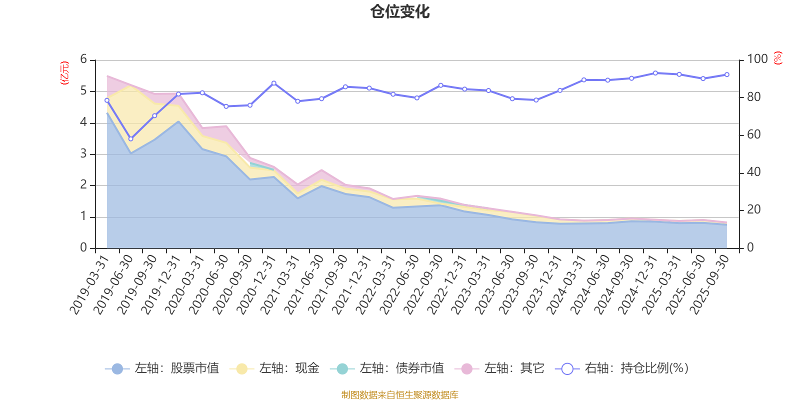 据定期报告数据统计,近三年平均股票仓位为87.27%,同类平均为83.73%。2024年末基金达到93.07%的最高仓位,2019年上半年末最低,为58.1%。
