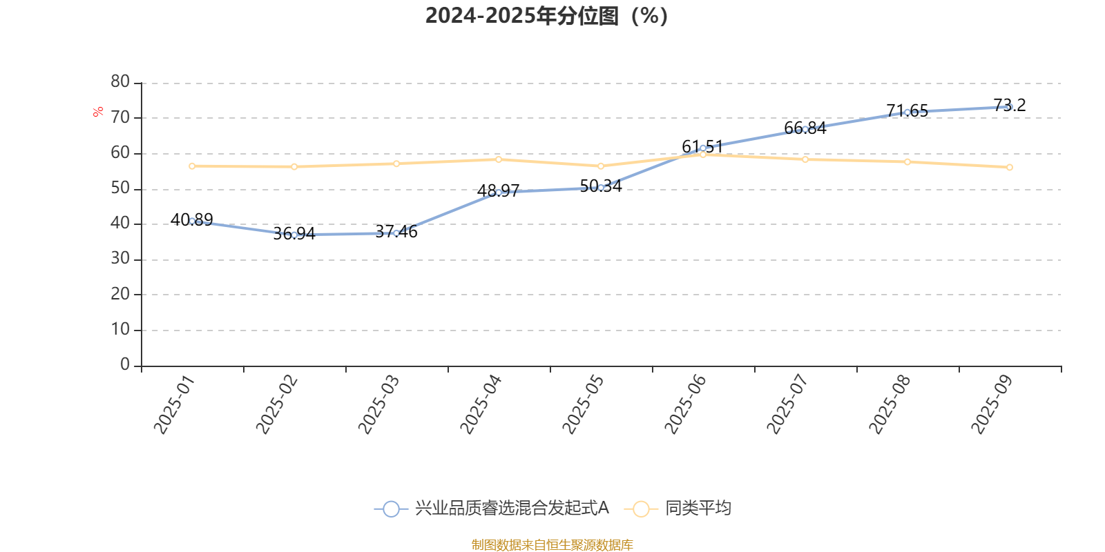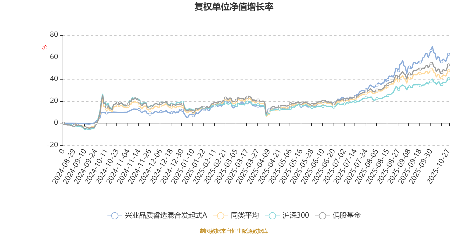 截至10月27日,兴业品质睿选混合发起式A近三个月复权单位净值增长率为24.54%,位于同类可比基金143/689;近半年复权单位净值增长率为43.24%,位于同类可比基金128/688;近一年复权单位净值增长率为48.08%,位于同类可比基金96/653。