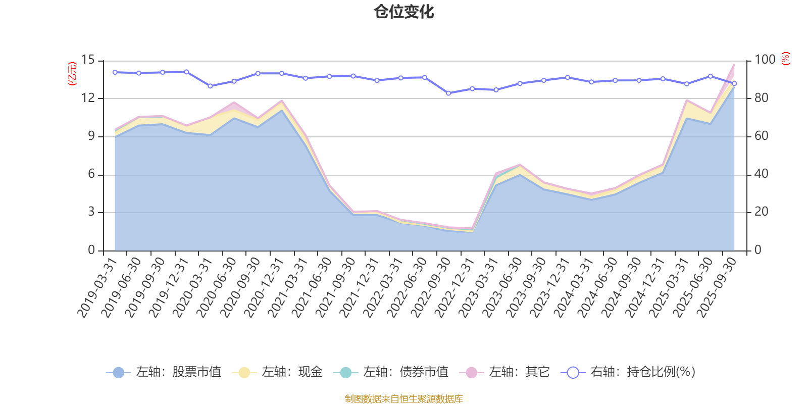 据定期报告数据统计,近三年平均股票仓位为88.71%,同类平均为72.35%。2019年末基金达到94.05%的最高仓位,2022年三季度末最低,为82.85%。