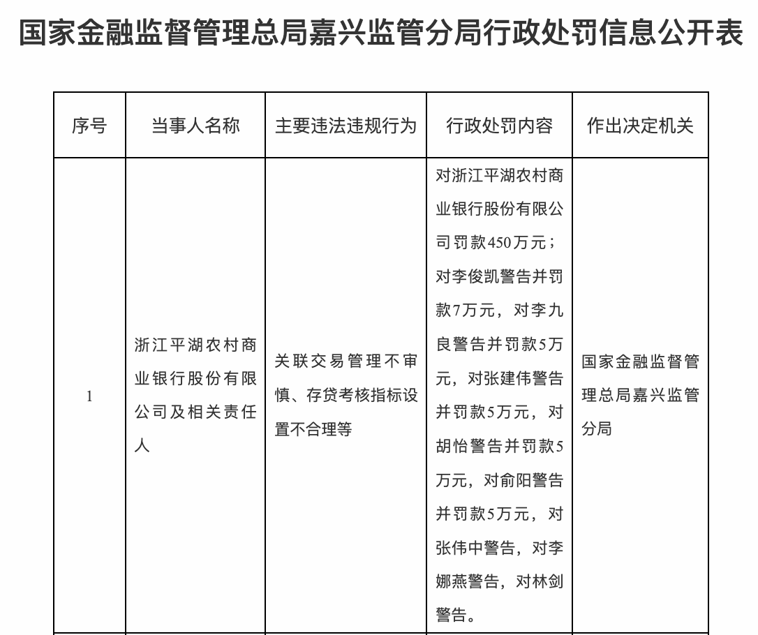 关联交易管理不审慎等,浙江平湖农商行被罚款450万元,多名责任人同步被罚