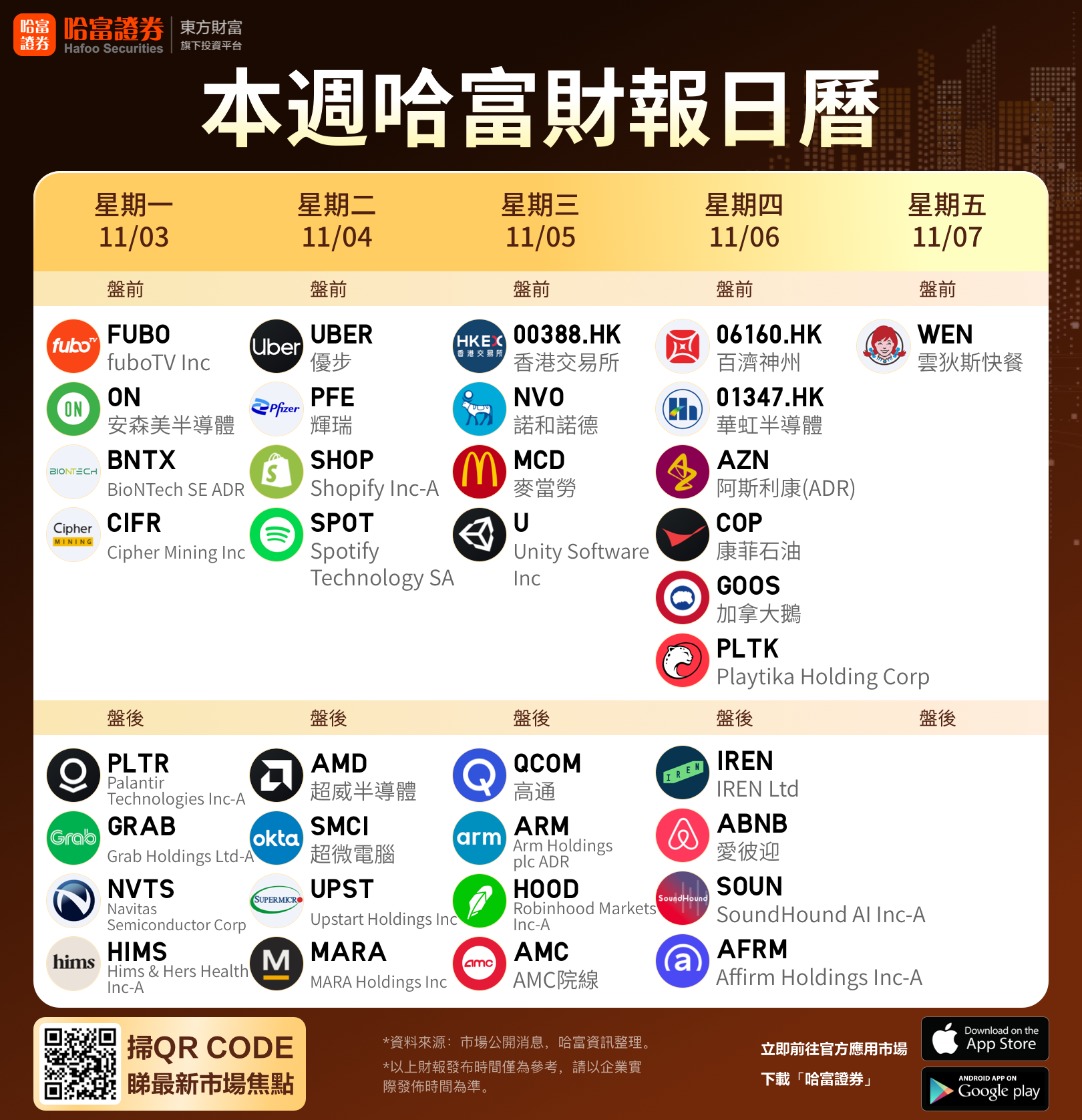 业绩方面, Applovin(APP.US) 、 Arm Holdings(ARM.US) 、 Robinhood(HOOD.US) 、 Figma Inc(FIG.US) 、 高通(QCOM.US) 将于美股盘后发布业绩; D-Wave Quantum(QBTS.US) 将于美股盘前发布业绩; 华虹半导体(01347.HK) 将公布业绩。