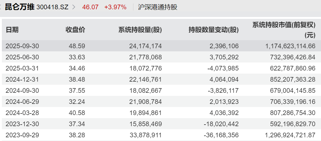 机构也重金押注,北上资金三季度末持股市值接近12亿元;公募基金三季度末持股接近8000万股,持股市值接近39亿元。 整体来看,北上资金与公募基金合计重仓昆仑万维近51亿元。从持股动向来看,北上资金已经连续两个季度增持,增持股数分别为370.53万股和239.61万股,最新持股数来到2417.42万股,为2023年年底以来最高水平。