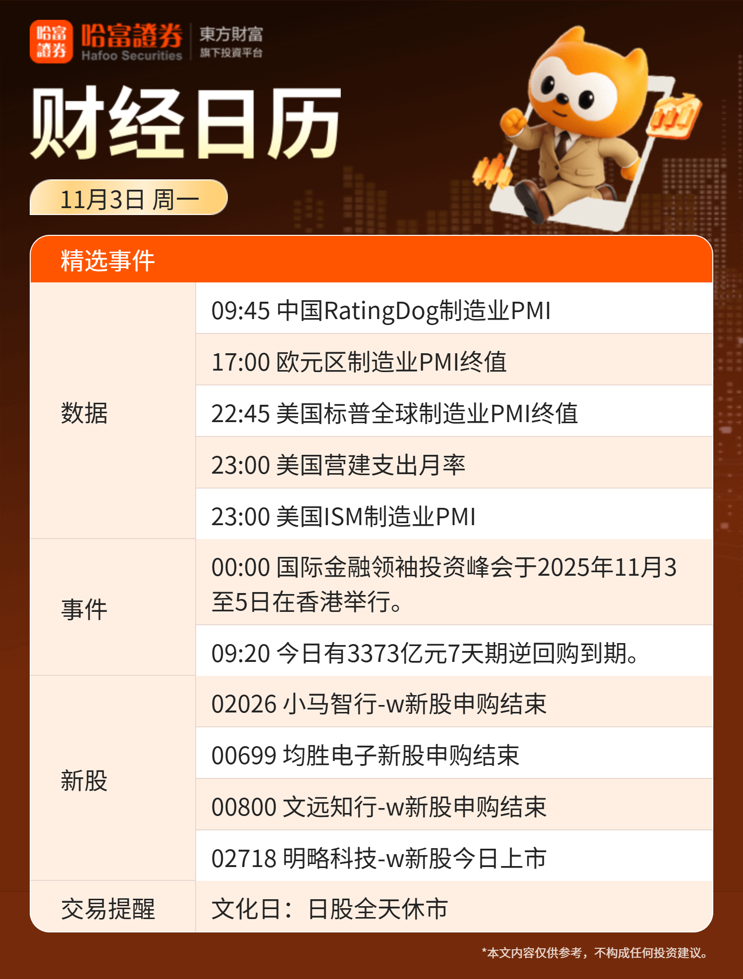 11月3日起,因美国进入冬令时间,美股交易时间将延后1小时,盘中交易时间段更改为北京时间22:30至次日凌晨05:00。此外,自周一起,美国CPI、非农等重要经济数据的公布时间将较夏令时延后1小时。