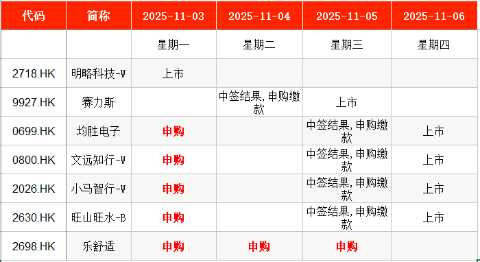 港股方面,Wind数据显示,本周(11月3日至11月6日)均胜电子(00699.HK)、文远知行-W(00800.HK)、小马智行-W(02026.HK)、旺山旺水-B(02630.HK)均将在本周一(11月3日)申购。乐舒适(02698.HK)将于本周一至本周三(11月3日至11月5日)申购。