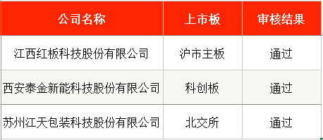 其中,拟在上交所主板IPO的江西红板科技股份有限公司(下称“红板科技”)、拟在科创板IPO的西安泰金新能科技股份有限公司(下称“泰金新能”)、拟在北交所IPO的苏州江天包装科技股份有限公司(下称“江天科技”)均成功过会。