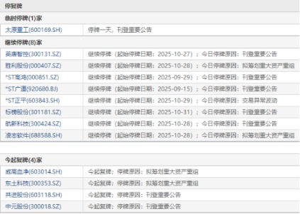 上证报中国证券网讯 11月3日,1家公司临停:太原重工,4家公司复牌:威高血净、东土科技、共进股份、中元股份。