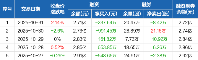 融资方面,当日融资买入1005.99万元,融资偿还1243.63万元,融资净偿还237.64万元,连续6日净偿还累计3053.5万元。融券方面,融券卖出5400股,融券偿还8.96万股,融券余量20.47万股,融券余额78.2万元。融资融券余额合计2.72亿元。