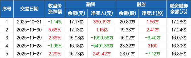 融资方面,当日融资买入2.66亿元,融资偿还2.62亿元,融资净买入360.19万元。融券方面,融券卖出3.29万股,融券偿还1.73万股,融券余量20.89万股,融券余额1175.29万元。融资融券余额合计17.28亿元。