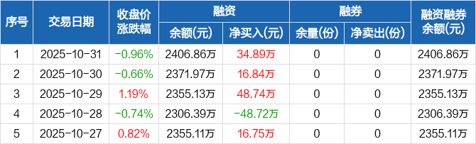 融资方面,当日融资买入239.44万元,融资偿还204.55万元,融资净买入34.89万元,连续3日净买入累计100.47万元。融券方面,融券卖出0份,融券偿还0份,融券余量0份,融券余额0元。融资融券余额合计2406.86万元。