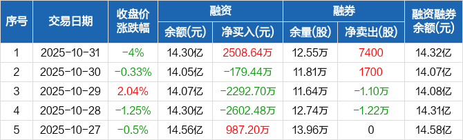 融资方面,当日融资买入7685.92万元,融资偿还5177.28万元,融资净买入2508.64万元。融券方面,融券卖出1.43万股,融券偿还6900股,融券余量12.55万股,融券余额144.45万元。融资融券余额合计14.32亿元。