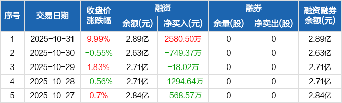 融资方面,当日融资买入8508.38万元,融资偿还5927.88万元,融资净买入2580.5万元。融券方面,融券卖出0股,融券偿还0股,融券余量0股,融券余额0元。融资融券余额合计2.89亿元。
