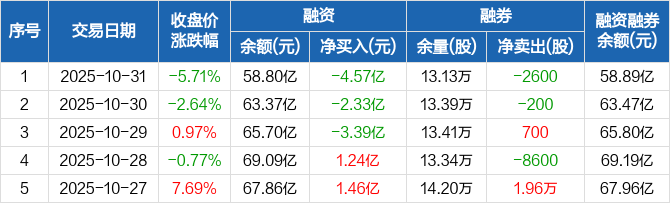 东山精密融资融券信息显示,2025年10月31日融资净偿还4.57亿元;融资余额58.8亿元,较前一日下降7.22%。