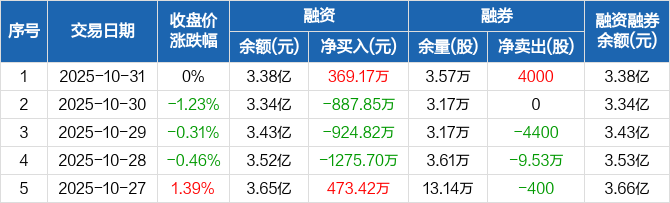 融资方面,当日融资买入2318.78万元,融资偿还1949.61万元,融资净买入369.17万元。融券方面,融券卖出5000股,融券偿还1000股,融券余量3.57万股,融券余额22.99万元。融资融券余额合计3.38亿元。