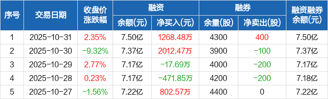 融资方面,当日融资买入3023.99万元,融资偿还1755.52万元,融资净买入1268.48万元。融券方面,融券卖出400股,融券偿还0股,融券余量4300股,融券余额10.67万元。融资融券余额合计7.5亿元。