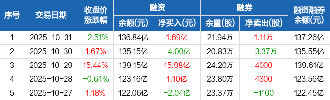 融资方面,当日融资买入31.42亿元,融资偿还29.73亿元,融资净买入1.69亿元,净买入额两市排名第八。融券方面,融券卖出1.66万股,融券偿还5500股,融券余量21.94万股,融券余额4164.97万元。融资融券余额合计137.26亿元。