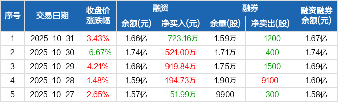 融资方面,当日融资买入2207.2万元,融资偿还2930.36万元,融资净偿还723.16万元。融券方面,融券卖出200股,融券偿还1400股,融券余量1.59万股,融券余额38.4万元。融资融券余额合计1.67亿元。