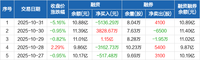 融资方面,当日融资买入2.53亿元,融资偿还3.04亿元,融资净偿还5136.29万元。融券方面,融券卖出5200股,融券偿还1100股,融券余量8.04万股,融券余额127.19万元。融资融券余额合计10.89亿元。