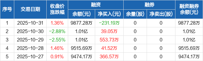 融资方面,当日融资买入677.71万元,融资偿还908.9万元,融资净偿还231.19万元。融券方面,融券卖出0股,融券偿还0股,融券余量0股,融券余额0元。融资融券余额合计9877.28万元。