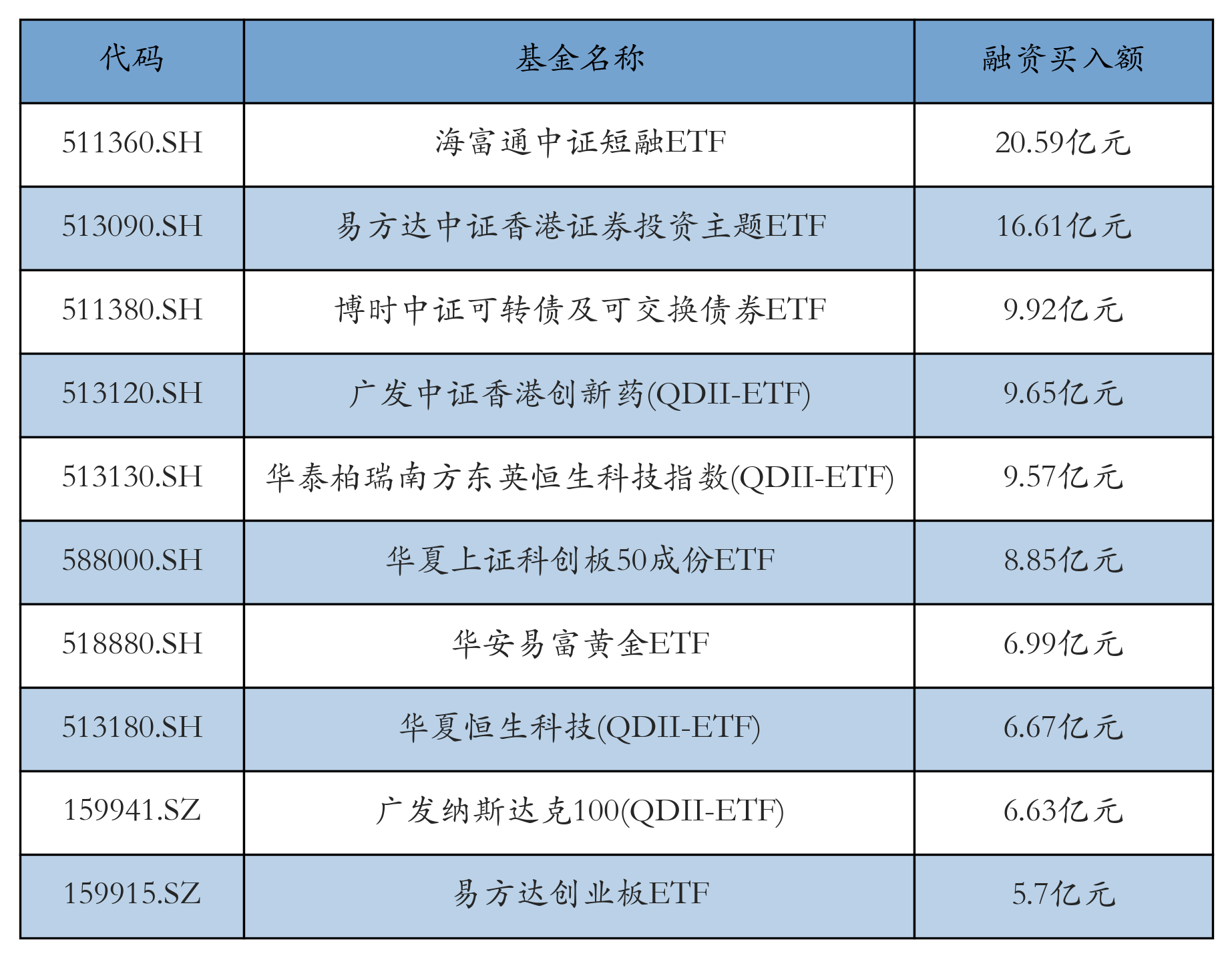 10月31日ETF融资买入额前三位分别为:海富通中证短融ETF(20.59亿元)、易方达中证香港证券投资主题ETF(16.61亿元)和博时中证可转债及可交换债券ETF(9.92亿元),前10具体见下表: