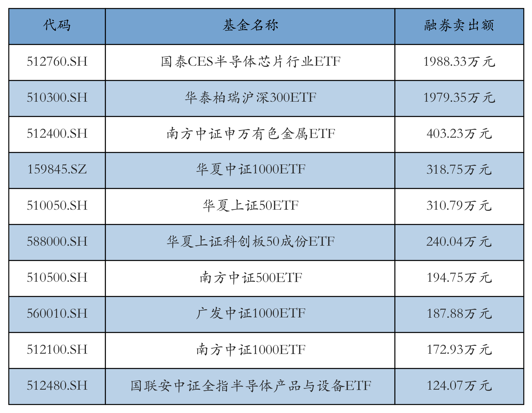 10月31日ETF融券卖出额前三位分别为:国泰CES半导体芯片行业ETF(1988.33万元)、华泰柏瑞沪深300ETF(1979.35万元)和南方中证申万有色金属ETF(403.23万元),前10具体见下表:
