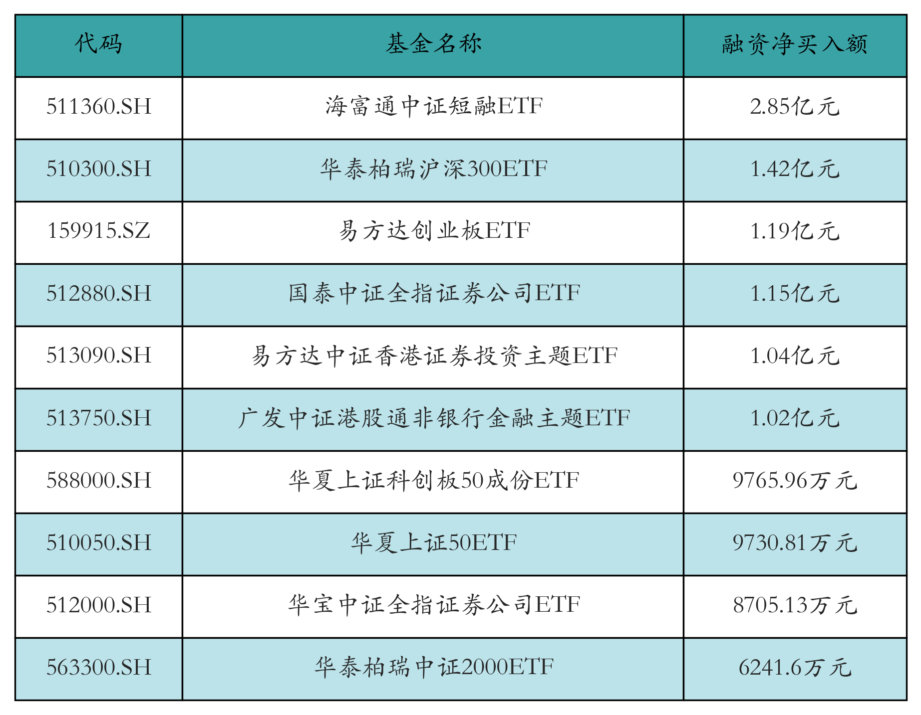 10月31日ETF融资净买入额前三位分别为:海富通中证短融ETF(2.85亿元)、华泰柏瑞沪深300ETF(1.42亿元)和易方达创业板ETF(1.19亿元),前10具体见下表: