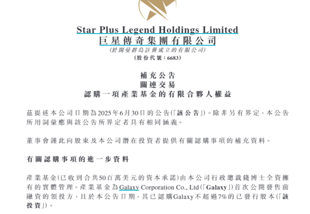 巨星传奇认为,成为Galaxy的战略股东预期将为公司带来多方面的协同效益,双方正就策略性合作的细节进行深入讨论,合作范畴包括但不限于与Galaxy艺人合作举办展览、演唱会、艺人IP及衍生品开发等。