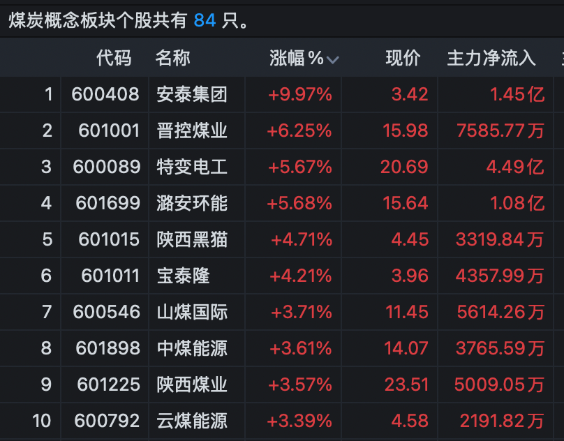 煤炭板块持续活跃,安泰集团涨停,晋控煤业、潞安环能、山煤国际、陕西煤业、云煤能源等跟涨。