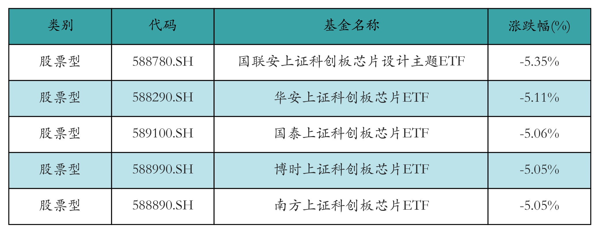 上周股票型ETF跌幅最大的5只ETF及其收益率分别为:国联安上证科创板芯片设计主题ETF(-5.35%)、华安上证科创板芯片ETF(-5.11%)、国泰上证科创板芯片ETF(-5.06%)、博时上证科创板芯片ETF(-5.05%)、南方上证科创板芯片ETF(-5.05%)。详情见下表: