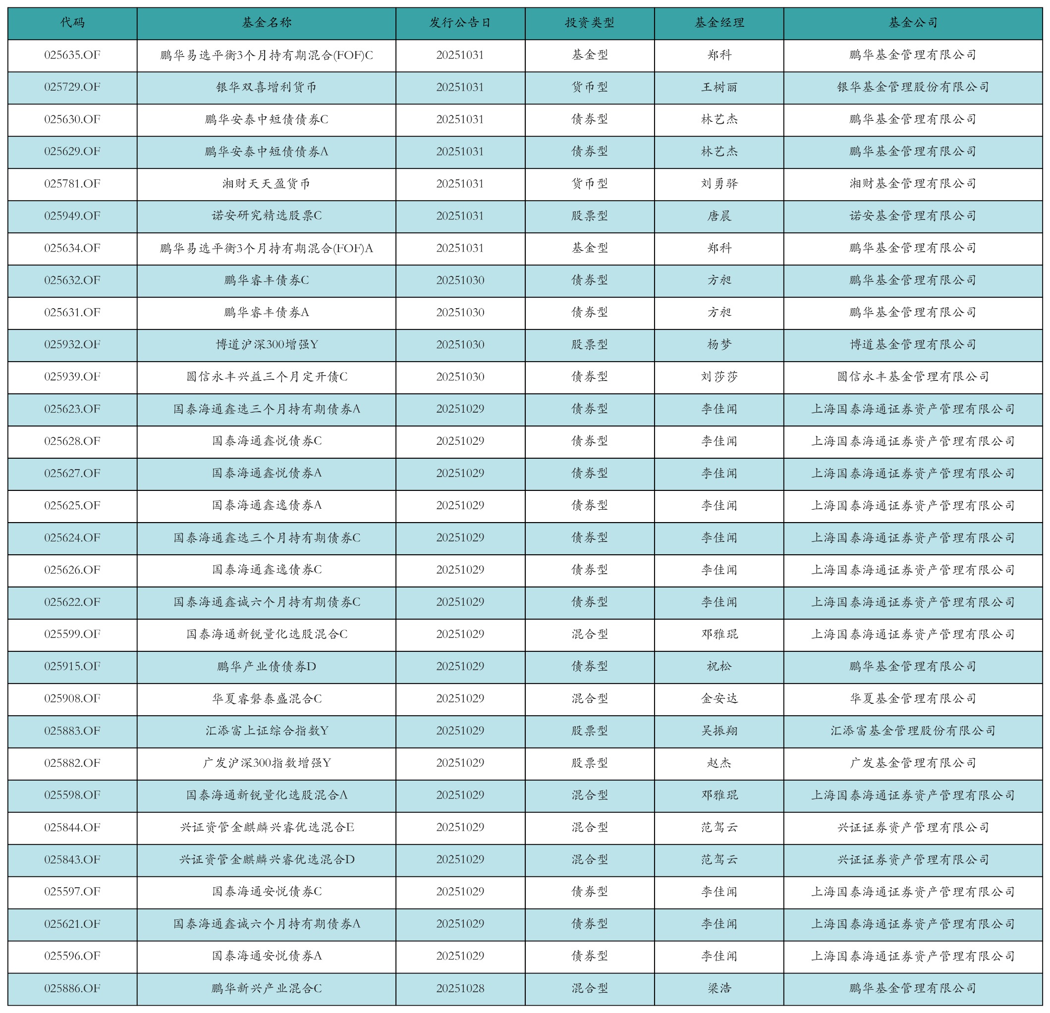 上周有30只新基金发行,分别为:鹏华易选平衡3个月持有期混合(FOF)C、银华双喜增利货币、鹏华安泰中短债债券C、鹏华安泰中短债债券A、湘财天天盈货币、诺安研究精选股票C、鹏华易选平衡3个月持有期混合(FOF)A、鹏华睿丰债券C、鹏华睿丰债券A、博道沪深300增强Y、圆信永丰兴益三个月定开债C、国泰海通鑫选三个月持有期债券A、国泰海通鑫悦债券C、国泰海通鑫悦债券A、国泰海通鑫逸债券A、国泰海通鑫选三个月持有期债券C、国泰海通鑫逸债券C、国泰海通鑫诚六个月持有期债券C、国泰海通新锐量化选股混合C、鹏华产业债债券D、华夏睿磐泰盛混合C、汇添富上证综合指数Y、广发沪深300指数增强Y、国泰海通新锐量化选股混合A、兴证资管金麒麟兴睿优选混合E、兴证资管金麒麟兴睿优选混合D、国泰海通安悦债券C、国泰海通鑫诚六个月持有期债券A、国泰海通安悦债券A、鹏华新兴产业混合C,详情见下表: