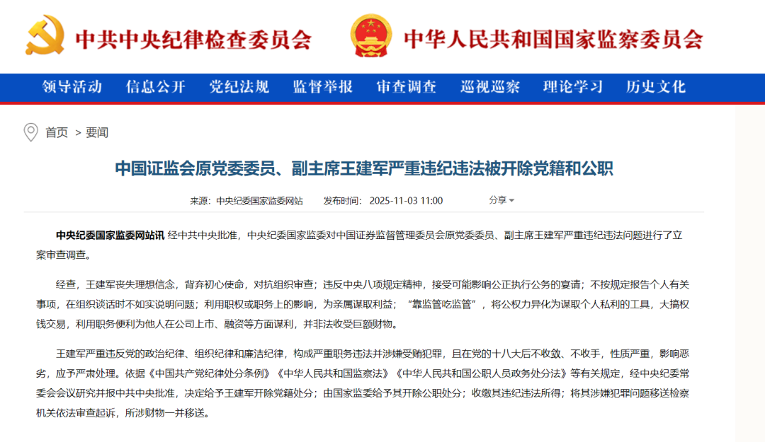 中国证监会原党委委员、副主席王建军严重违纪违法被开除党籍和公职