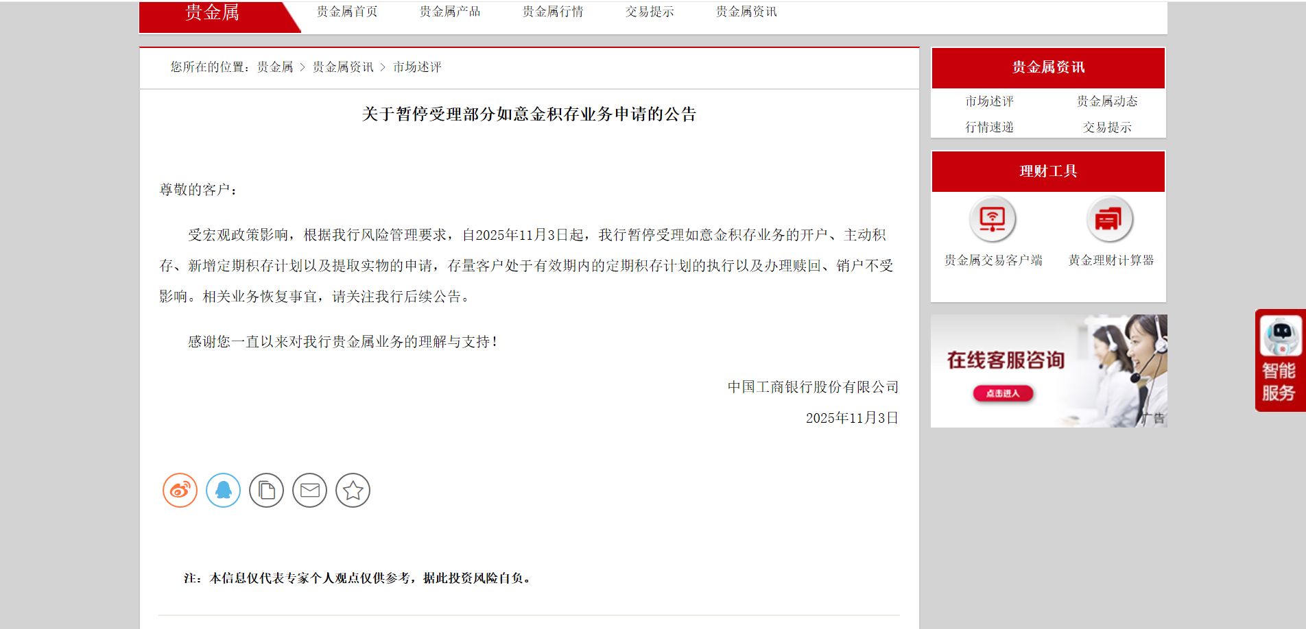 11月3日,工商银行今日发布公告,受宏观政策影响,根据我行风险管理要求,自2025年11月3日起,我行暂停受理如意金积存业务的开户、主动积存、新增定期积存计划以及提取实物的申请,存量客户处于有效期内的定期积存计划的执行以及办理赎回、销户不受影响。相关业务恢复事宜,请关注我行后续公告。
