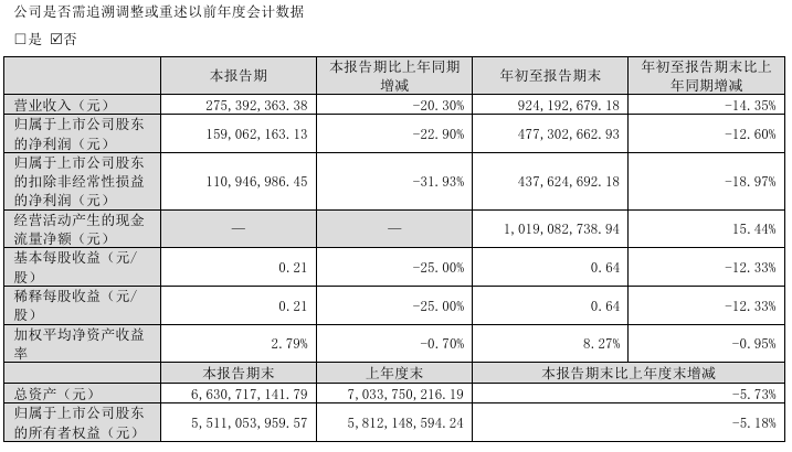 其中第三季度,公司营业收入为2.75亿元,同比下降20.3%;归母净利润为1.59亿元,同比下降22.9%;扣非归母净利润为1.11亿元,同比下降31.9%;EPS为0.2125元。
