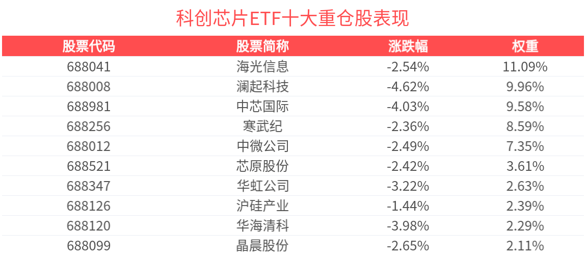 数据显示,截至2025年10月31日,上证科创板芯片指数前十大权重股分别为海光信息、寒武纪、澜起科技、中芯国际、中微公司、芯原股份、华虹公司、拓荆科技、佰维存储、沪硅产业,前十大权重股合计占比60.55%。