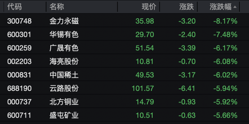 有色金属板块重挫,板块盘中跌幅一度接近4%,后有所收窄。金力永磁、华锡有色、广晟有色、海亮股份、中国稀土等多股跌幅超过6%,北方铜业、腾远钴业、大地熊、永兴材料、云南铜业等跌幅超过5%。
