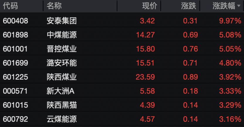 主要行业板块和赛道方面,若按照申万一级行业划分,煤炭板块领涨,板块盘中涨幅一度超过3%。安泰集团涨停,晋控煤业、中煤能源、潞安环能、陕西煤业、陕西黑猫、云煤能源等跟涨。