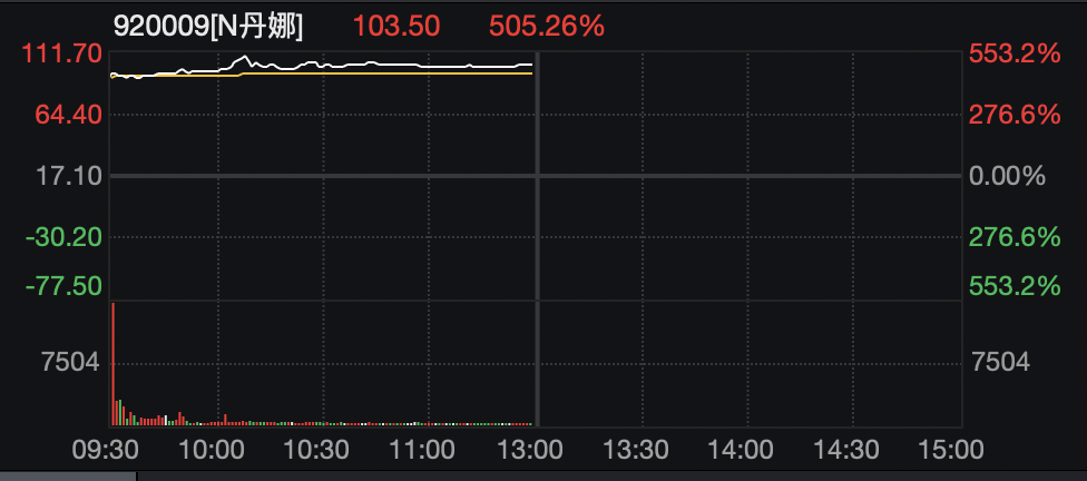 今天A股市场有一只新股上市,为丹娜生物,盘中涨幅一度高达553.22%。
