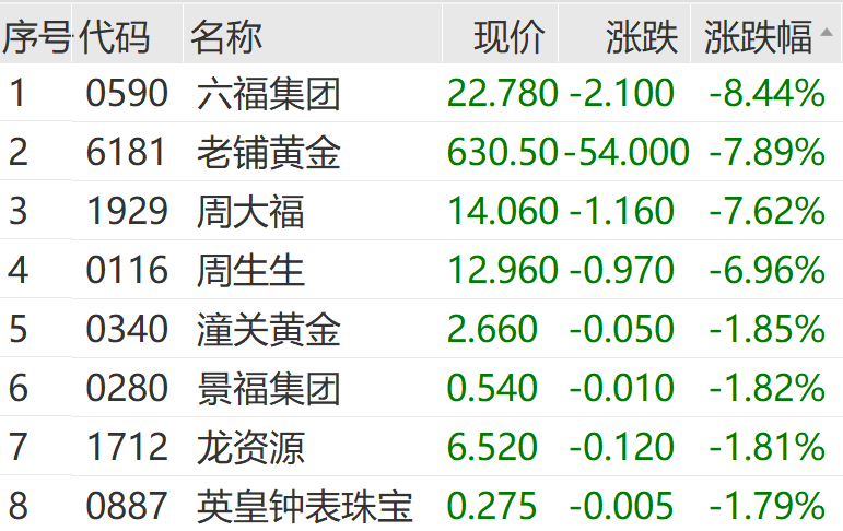 港股方面,六福集团跌超8%,老铺黄金、周大福、周生生等大跌。