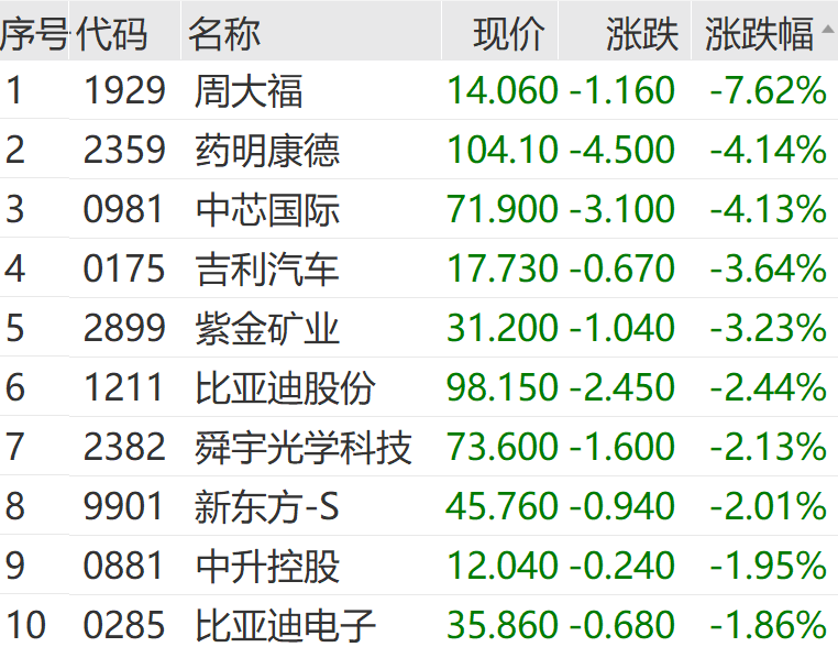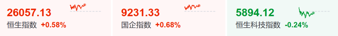 港股市场上午同步震荡。截至午间收盘,恒生指数涨0.58%,恒生科技指数跌0.24%,恒生国企指数涨0.68%。周大福跌超7%,领跌恒指成份股。