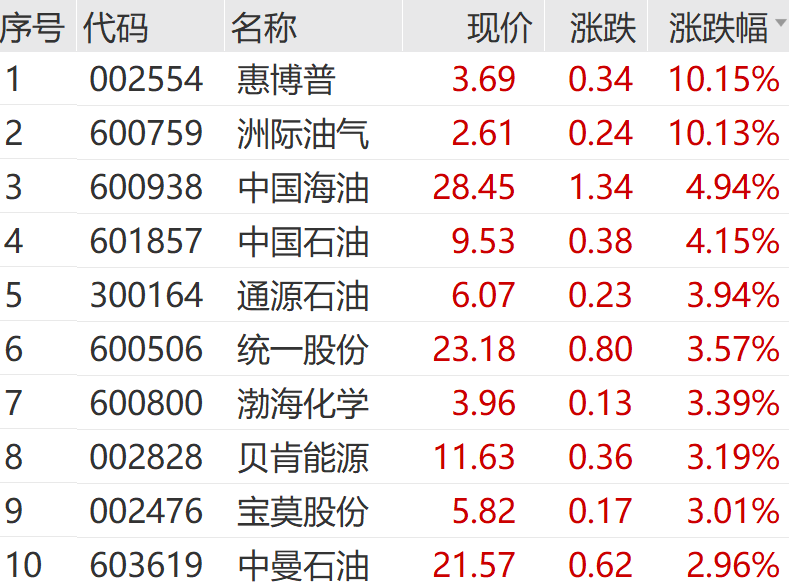 油气板块方面,上午惠博普、洲际油气涨停,中国海油涨近5%,中国石油涨超4%,中国石化涨近2%。