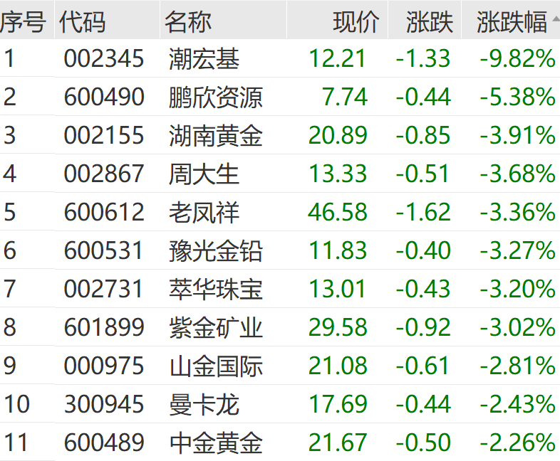 黄金珠宝指数走低,潮宏基逼近跌停,鹏欣资源、湖南黄金、周大生、老凤祥等跌幅居前。