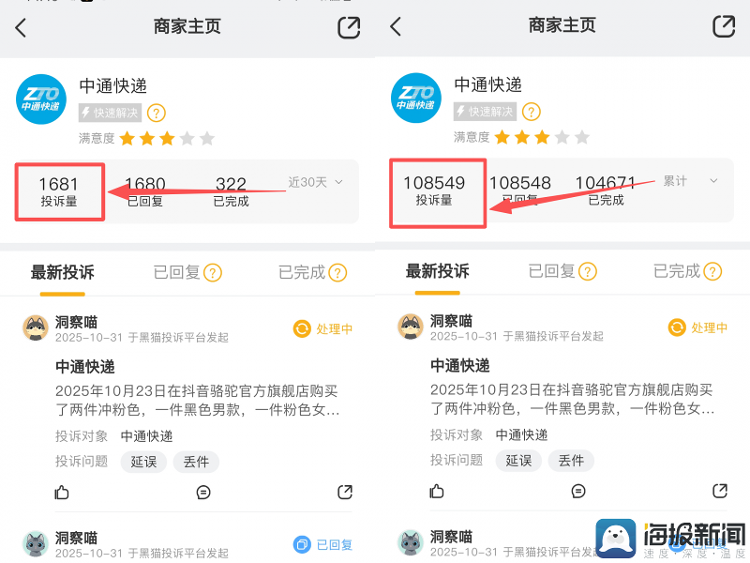 记者在黑猫投诉平台搜索“中通快递”显示,截至今年10月31日的统计,中通快递累计投诉量达108549条,近30天内新增投诉1681条,其中占比较多的投诉问题是“丢件、延误、售后服务欠缺、已到不配送、商品有损”等。