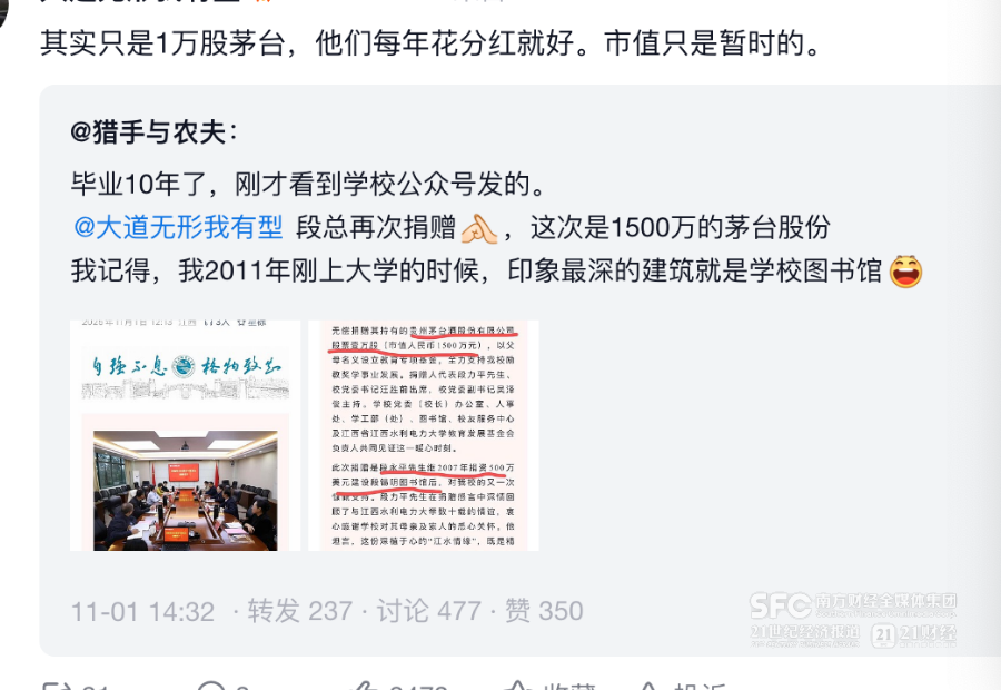 段永平捐赠茅台股票价值1500万元
