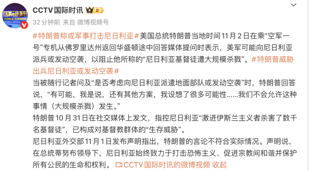 10月31日,特朗普在社交媒体上发文,宣布再次将尼日利亚列为国际宗教自由法案框架下的“特别关注国”,指控尼“激进伊斯兰主义者杀害了数千名基督徒”,已构成对基督教群体的“生存威胁”。