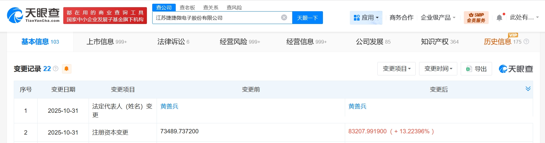 南方财经11月3日电,天眼查工商信息显示,近日,捷捷微电(300623)发生工商变更,注册资本由约7.35亿人民币增至约8.32亿人民币,增幅约13%。江苏捷捷微电子股份有限公司成立于1995年3月,法定代表人为黄善兵,经营范围为半导体分立器件、电力电子元器件的制造、销售,经营本企业自产产品及技术的出口业务和本企业所需的机械设备、零配件、原辅材料及技术的进口业务。股东信息显示,该公司由江苏捷捷投资有限公司、黄善兵、南通中创投资管理有限公司等共同持股。