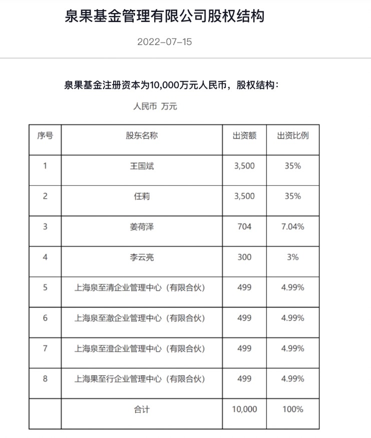 从公司股权结构来看,王国斌、任莉均持有泉果基金35%股权,姜荷泽、李云亮分别持有7.04%、3%股权,上海泉至清企业管理中心(有限合伙)、上海泉至澈企业管理中心(有限合伙)、上海泉至澄企业管理中心(有限合伙)、上海果至行企业管理中心(有限合伙)这四家公司则均持有泉果基金4.99%股权。